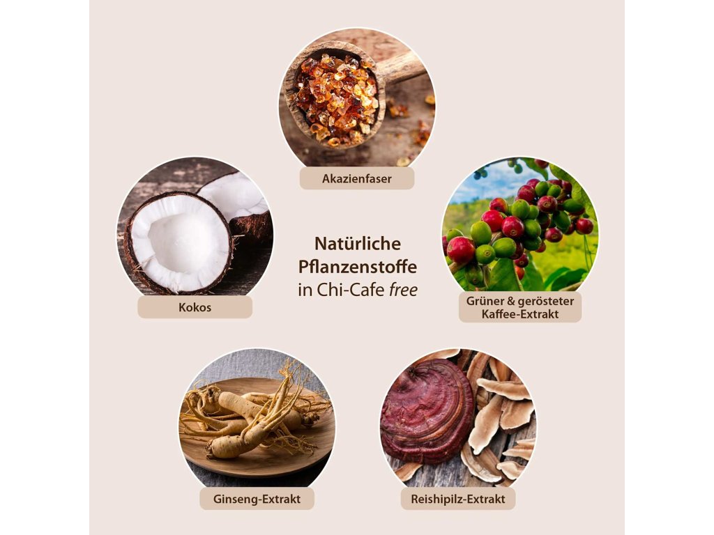 Chi Café Free Dr. Jacobsa ukusan je napitak od kave bez kofeina, obogaćen zelenim zrncima kave, gljivom reishi, kokosovim mlijekom i akacijinim vlaknima. Sadrži magnezij i vitamin B12, prikladan je za vegane te ne sadrži dodani šećer, laktozu ni gluten.