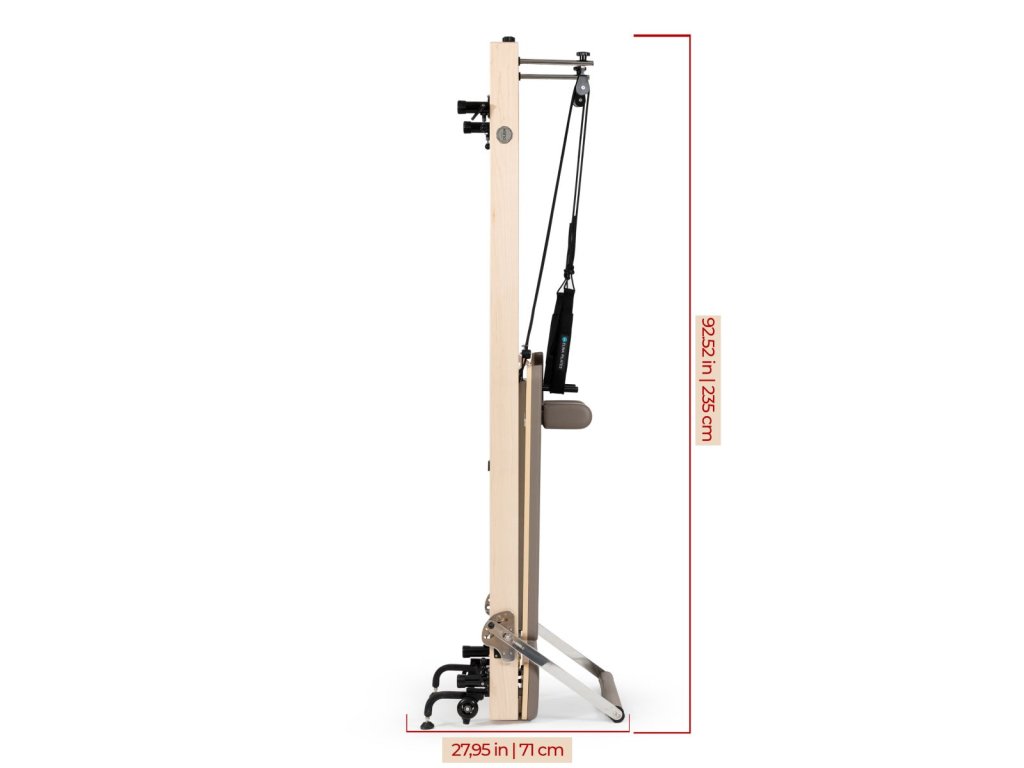 Elina Pilates Vertical Reformer – kompaktan i profesionalni reformer za kućnu upotrebu koji se može sigurno sklopiti u okomiti položaj. Izrađena od drva američkog javora, s podesivom visinom, tihim kolicima i bogatim priborom.