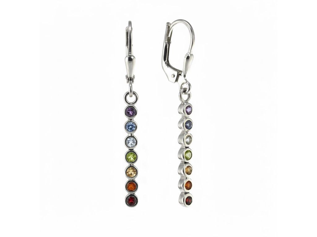 Naušnice s čakra kamenjem izrađene od 925 srebra (ili u pozlaćenoj verziji) kombiniraju sedam dragog kamenja koji predstavljaju glavna energetska središta tijela. Nježan, ručno izrađen nakit s naglaskom na odvažnoj boji.